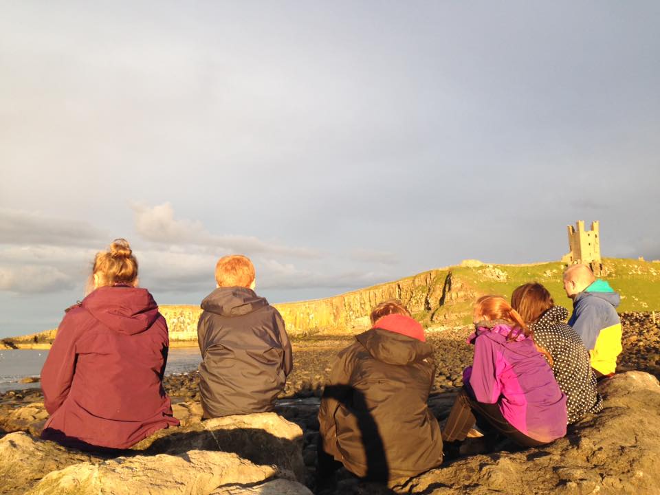 We then cooked tea, which was pasta with Bolognese sauce and jelly in pots for pudding and a hot chocolate. A little while later, after cleaning up, we took a stroll along the beach up to Bamburgh castle and sat on an ancient sea bed and talked about many things. As it was getting dark, we started to head back to the campsite and I caught the others on camera as silhouettes which was very nice.